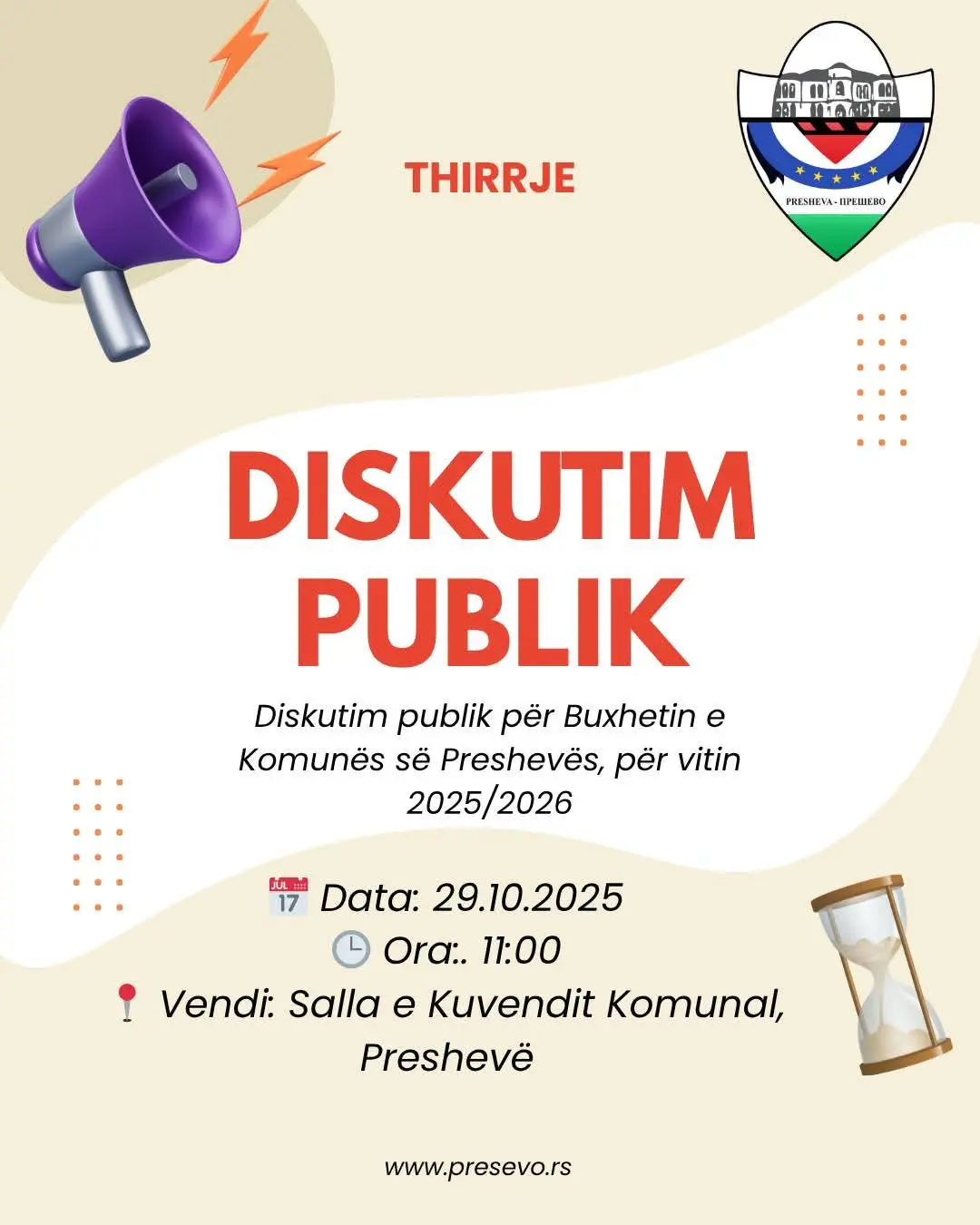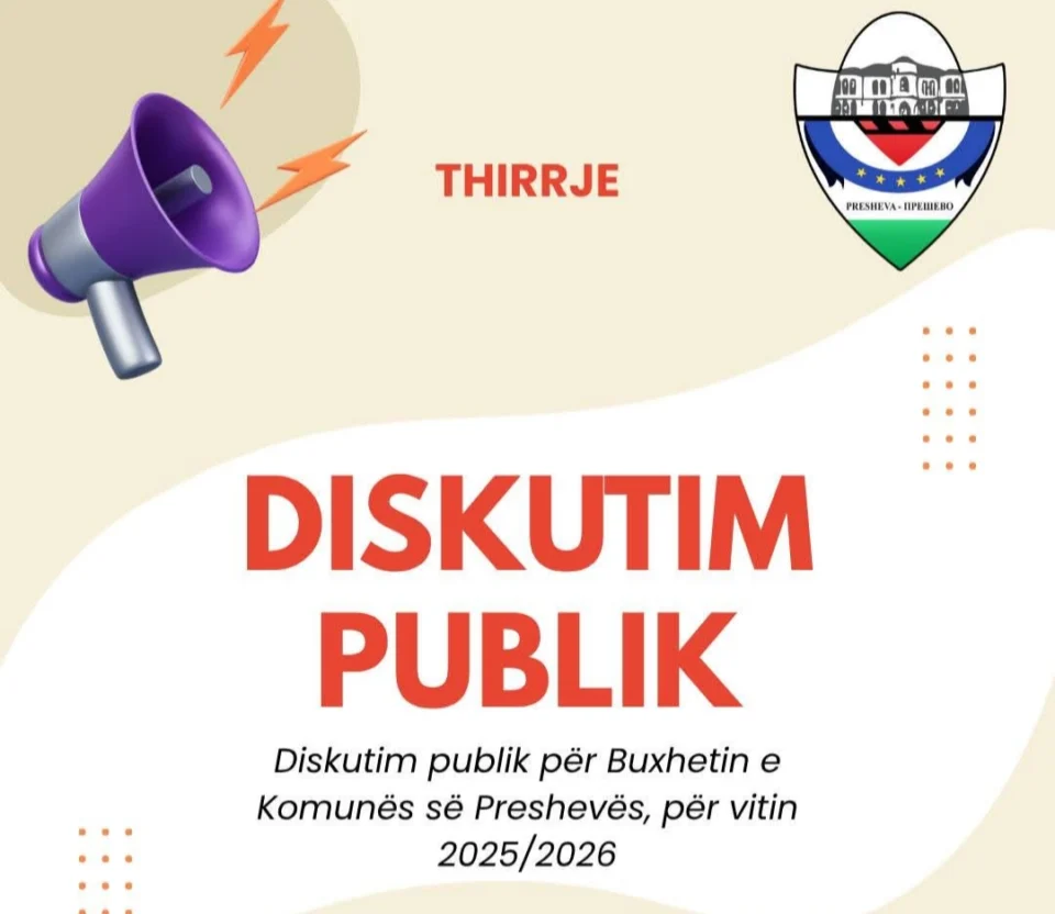 Komuna e Preshevës ka ftuar qytetarët dhe përfaqësuesit e institucioneve lokale që të marrin pjesë në diskutimin publik për Projekt-Buxhetin Komunal për vitin 2025/2026, i cili do të mbahet më 29 tetor 2025, në ora 11:00, në Sallën e Kuvendit Komunal në Preshevë.
