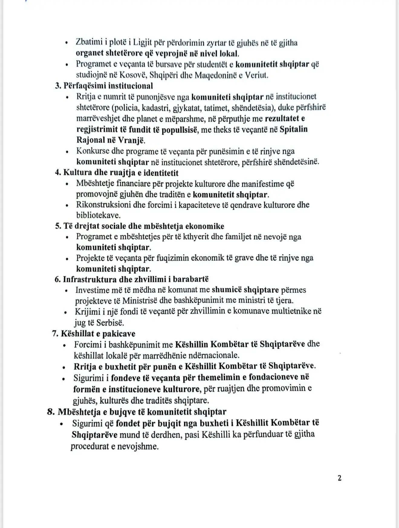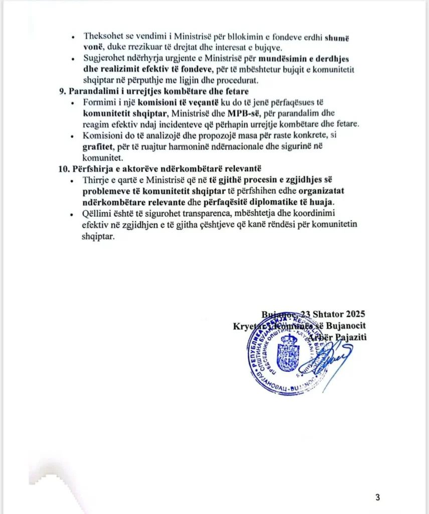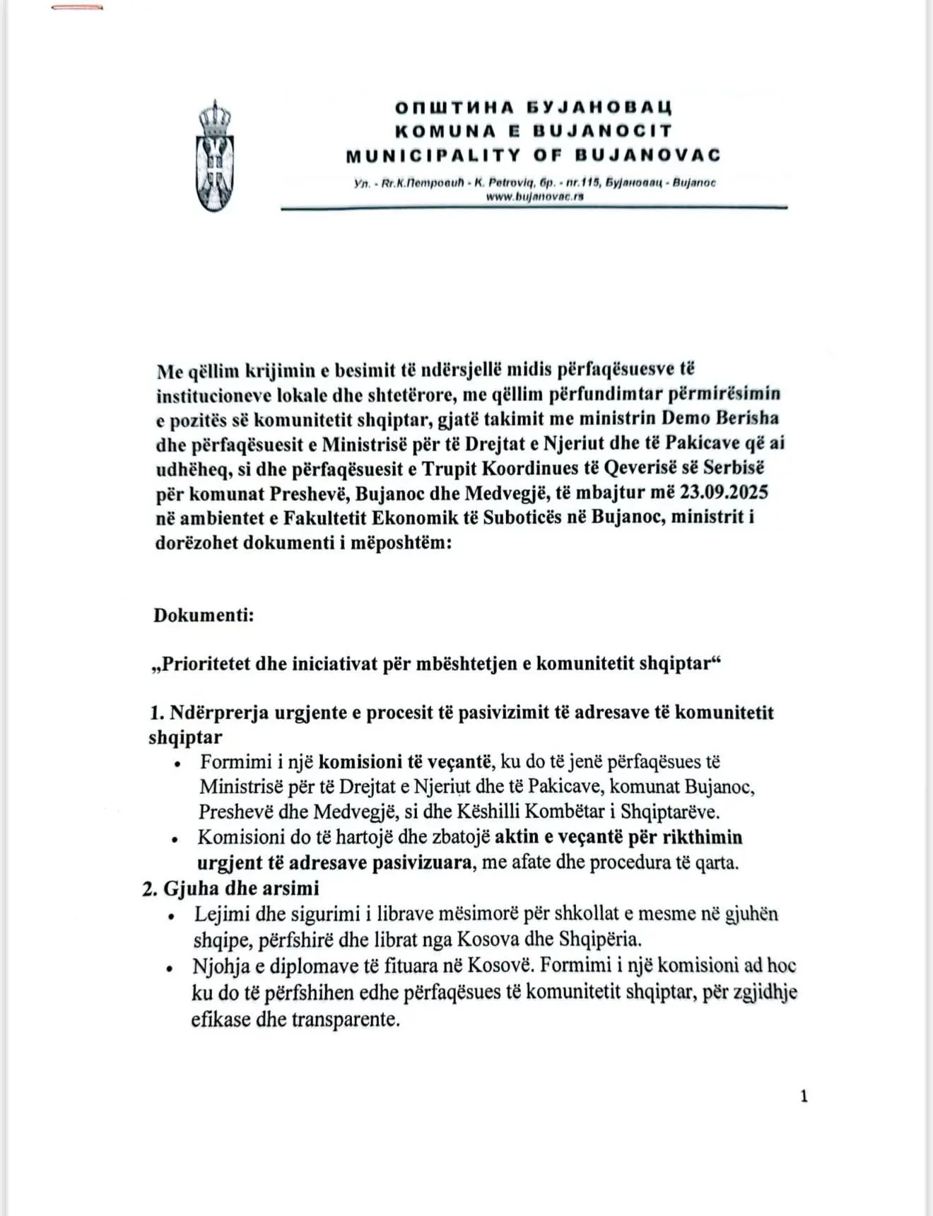 Kjo është përmbajtja e dokumentit që ia dorëzova ministrit të Ministrisë për të Drejtat e Njeriut, Pakicave dhe Dialogut Shoqëror, Demo Berisha, dhe kryetarit të Trupit Koordinues, Aleksandar Martinoviq, gjatë takimit të zhvilluar më 23.09.2025 në Bujanoc.